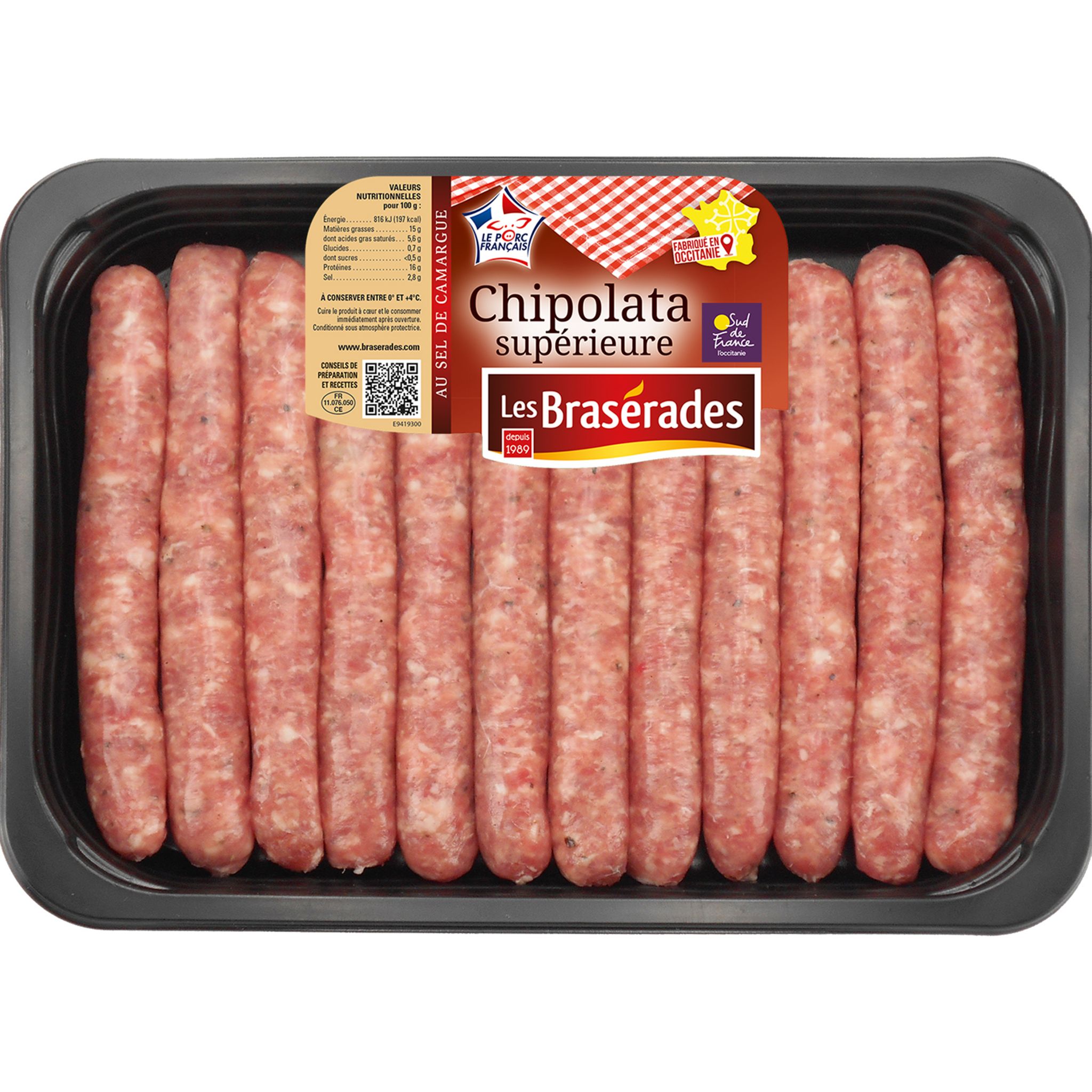 Élaborée à partir de viande de porc d'origine française et de boyau naturel, au sel de Camargue, Sud de France. Fabriquée en Occitanie.