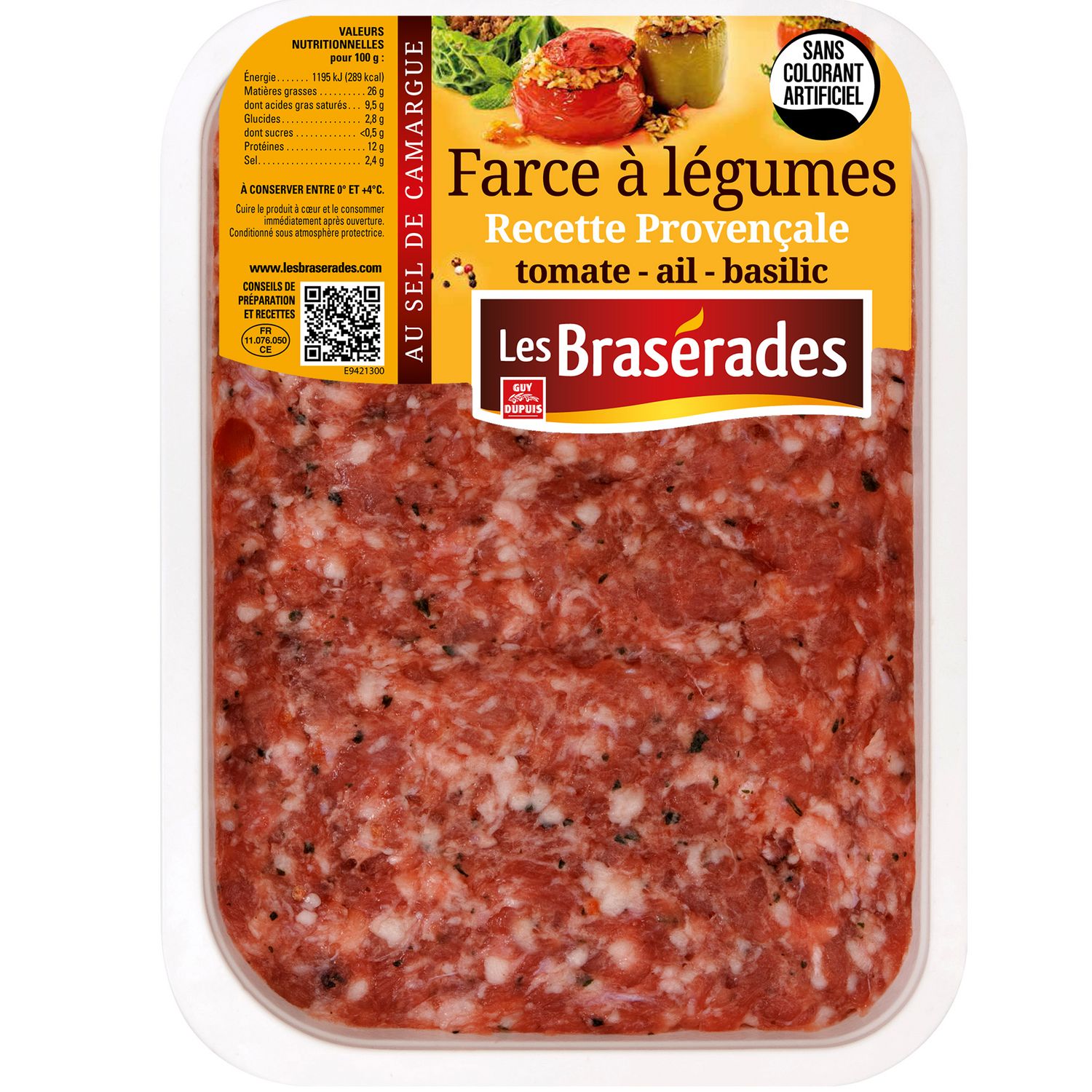 Élaborée à partir de viande de porc et de véritables ingrédients : dés de tomate, feuilles de basilic ciselées, ail, sel de Camargue.