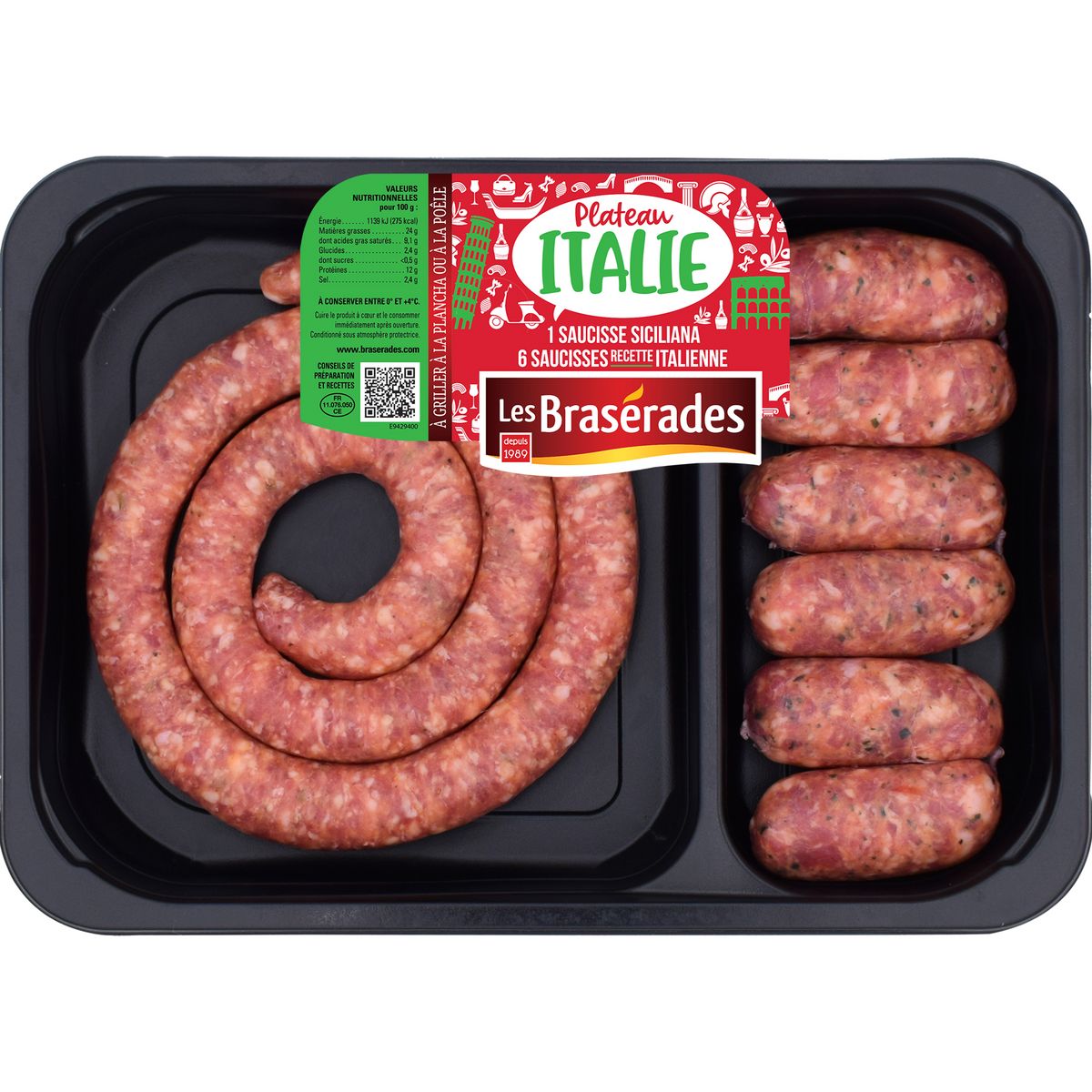 Ingrédients : Ingrédients: Saucisse sicilienne : viande et gras de porc** 90%, eau, sel de Camargue, sirop de glucose, antioxydants: E301, E392, épices, colorant : rouge de betterave, plante aromatique, oléorésine de paprika, huile essentielle de poivre, correcteurs d'acidité : E331, E262, fenouil 0,7%, boyau naturel de mouton.