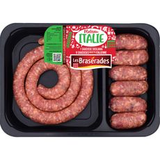 Saucisse italienne : Viande et gras de porc* 86%, tomate 5%, tomate semi-séchée 2%, sel de Camargue, sirop de glucose, antioxydants : E301, E392, épices, colorant : rouge de betterave, plante aromatique, oléorésine de paprika, huile essentielle de poivre, correcteurs d'acidité : E331, E262, basilic 1%, Chianti <1% (SULFITES), huile d'olive, ail, boyau naturel de porc. *Origine : France **Origine : UE