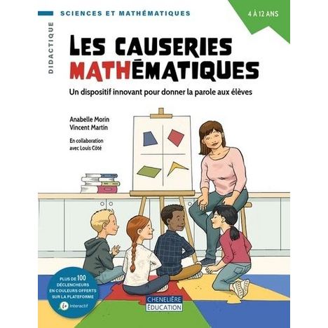 Découvrez le monde passionnant des causeries mathématiques, un dispositif innovant qui révolutionnera votre approche de renseignement des mathématiques en alte. De courte durée, la causerie mathématique est une discussion de groupe axée sur un problème mathématique stimulant présenté par l'intermédiaire d'un déclencheur imagé ou symbolique. Dans cet ouvrage, Anabelle Morin et Vincent Martin vous accompagnent dans la création de séances captivantes, la conception de déclencheurs sur mesure et la stimulation des échanges et de la mise en commun de stratégies mathématiques entre les élèves. Que voussoyez une personne enseignante, étudiante ou conseillère pédagogique, cet ouvrage vous propose : de précieuses informations pour comprendre en profondeur la nature et le fonctionnement des causeries mathématiques , plus de 100 déclencheurs clés en main couvrant les cinq domaines mathématiques , des questions de relance, des suggestions de variantes et des conseils spécifiques pour piloter chaque causerie avec succès , des stratégies pour créer des déclencheurs personnalisés en fonction des besoins et de la progression des élèves , plus de 100 fiches reproductibles en couleurs. Que vous interveniez à l'éducation préscolaire ou au niveau primaire, Les causeries mathématiques représentent une ressource inestimable pour dynamiser votre enseignement. En intégrant cette approche complémentaire à votre pratique, vous favoriserez l'intérêt et l'engagement des élèves de votre alte. Donnez-leur la parole dès maintenant et créez une expérience d'apprentissage mathématique plus vivante et enrichissante que jamais !
