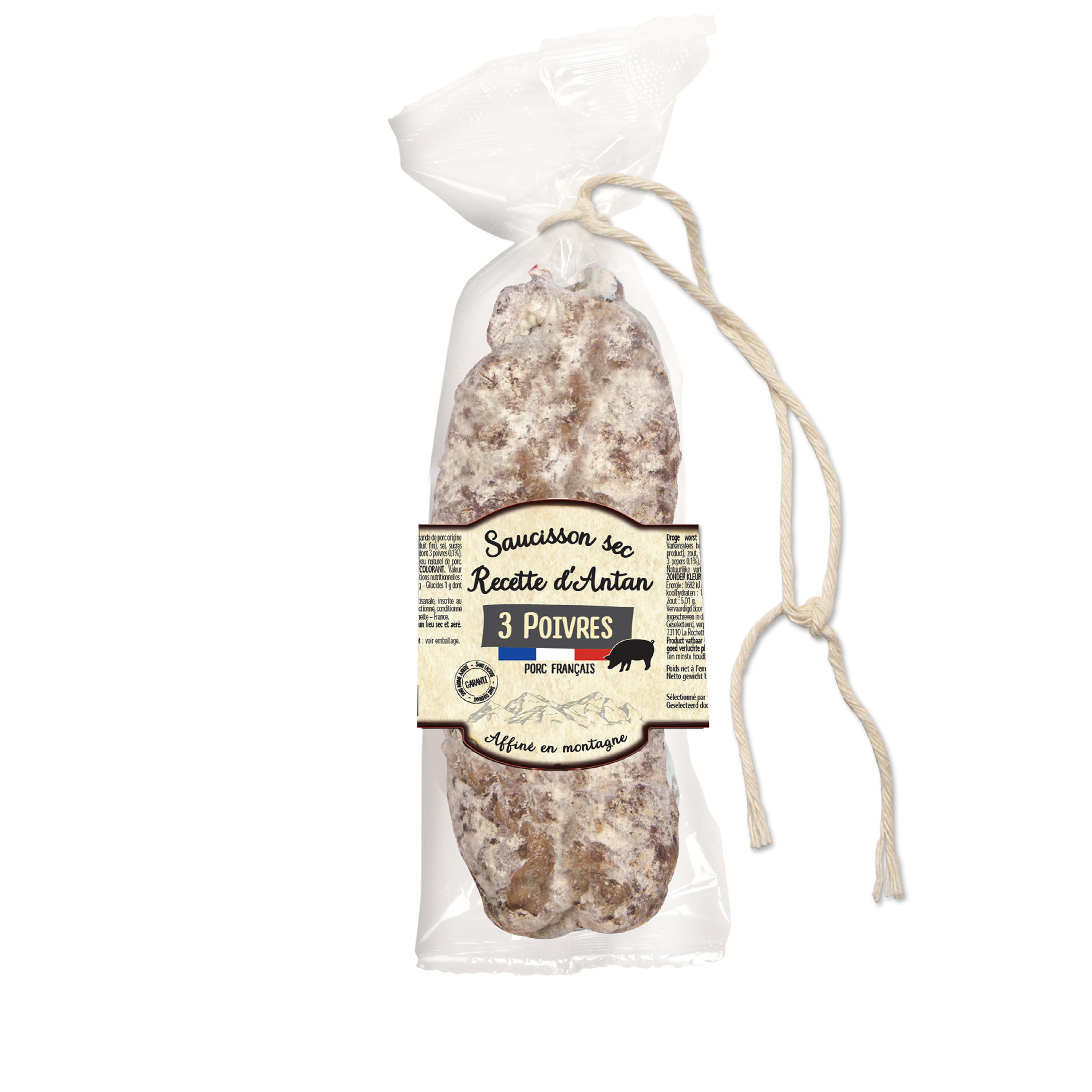 Ingrédients : Saucisson sec artisanal aux 3 Poivres :