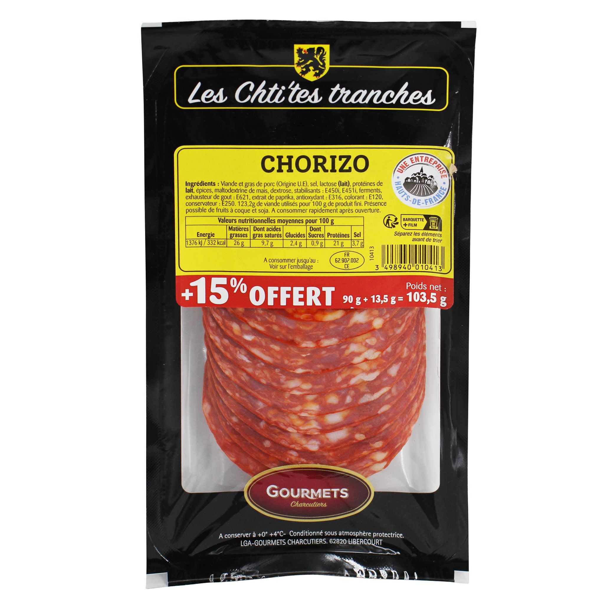 CHORIZO : maigre et gras de porc (origine UE), sel, lactose LAIT, épices, protéines de LAIT, maltodextrine de mais, dextrose, stabilisants : E450-E451, exhausteur de goût : E621, antioxydant : E316, conservateur : E250, colorant : E120, dextrine, ferments. 123.6 g de viande utilisés pour 100 g de produit fini.