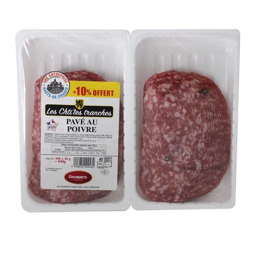 Viande de porc (origine France), sel, lactose (lait), dextrose, poivre noir en grains (0.3%), épices, ail, antioxydant : E316, ferments, conservateurs : E252-E250. 130 g de viande utilisés pour 100 g de produit fini. Présence possible de fruits à coque, soja.