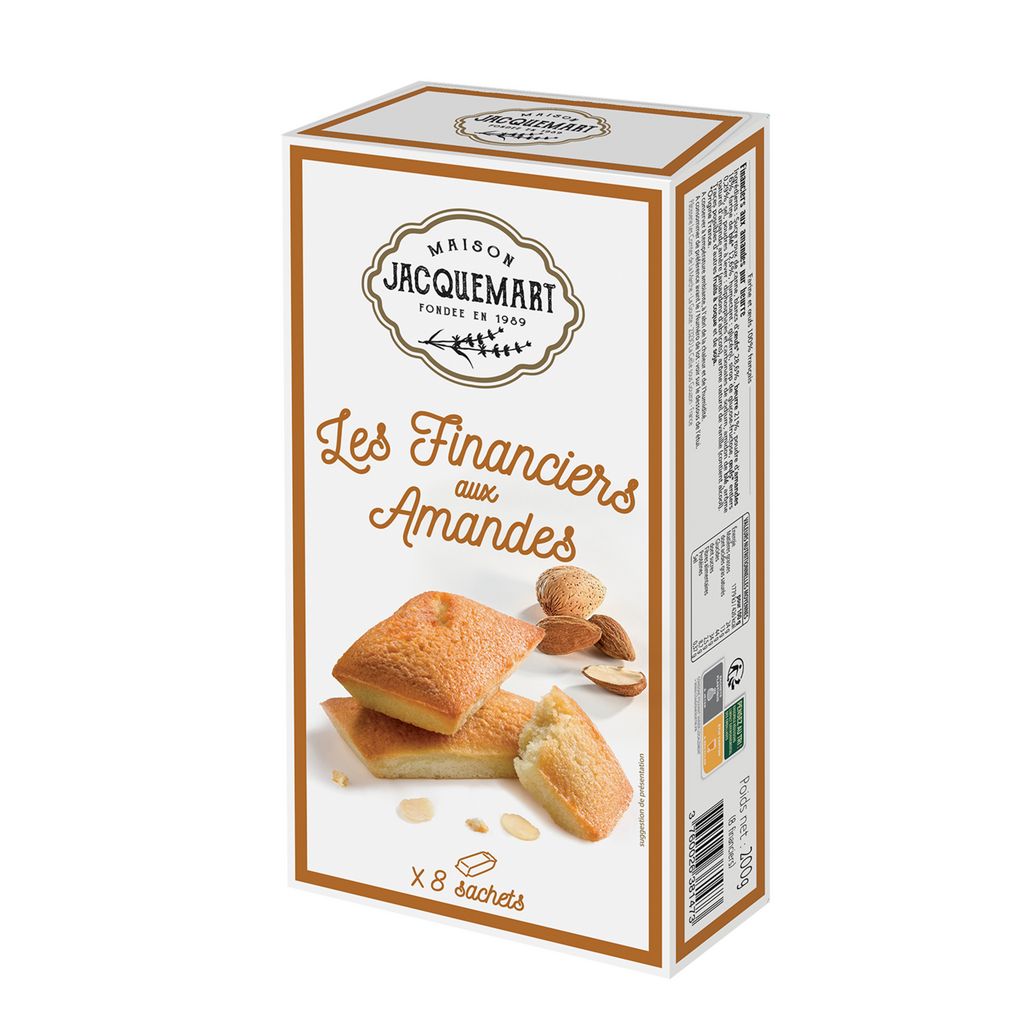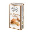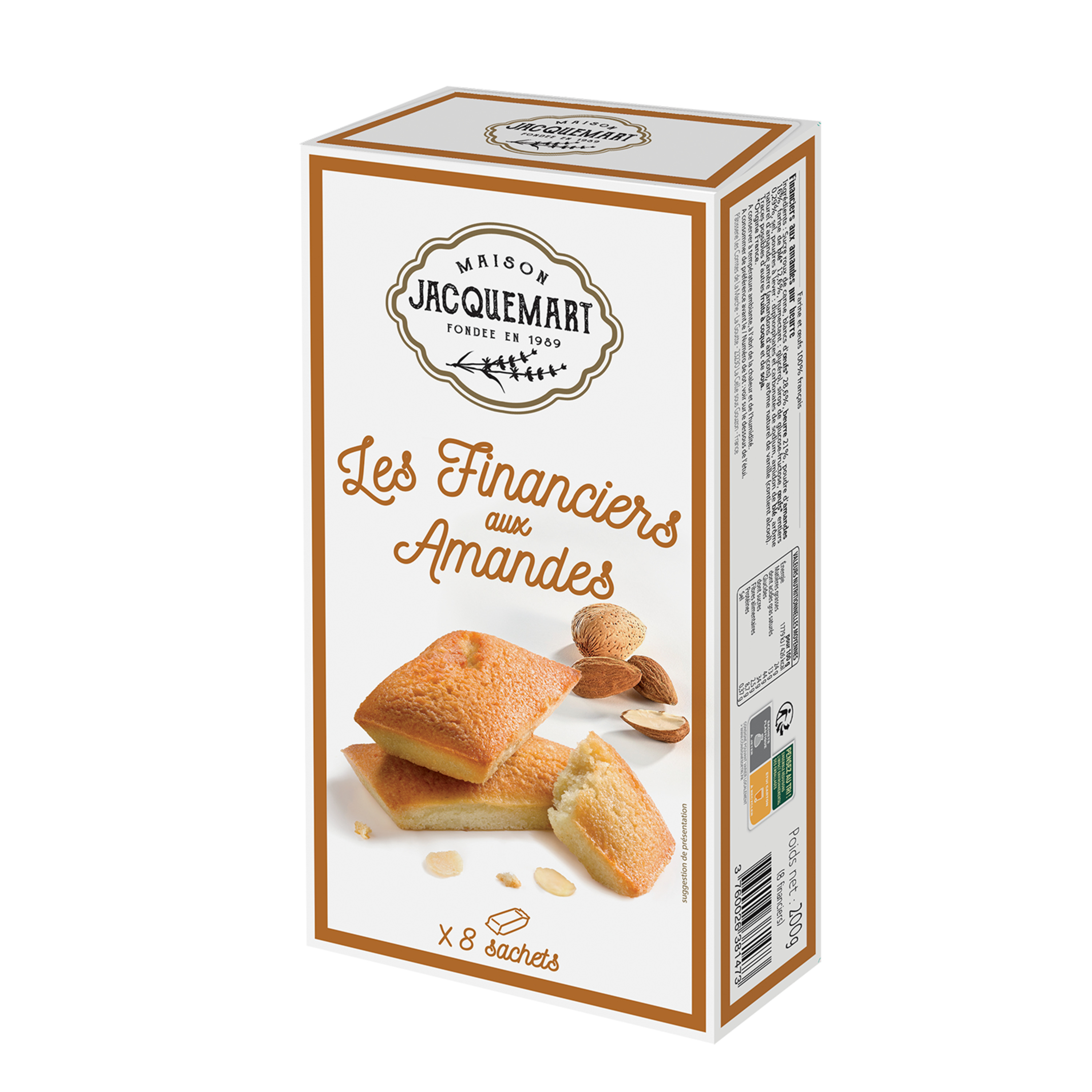 Ingrédients : Sucre, blancs d’ŒUFs, BEURRE 17%, poudre d'AMANDES 16%, farine de BLÉ 12%, humectant : glycérol, sirop de glucose, sel, poudre à lever : carbonates de sodium, arôme naturel d'amande amère (amandons d'abricots), arôme naturel de vanille (contient alcool).
