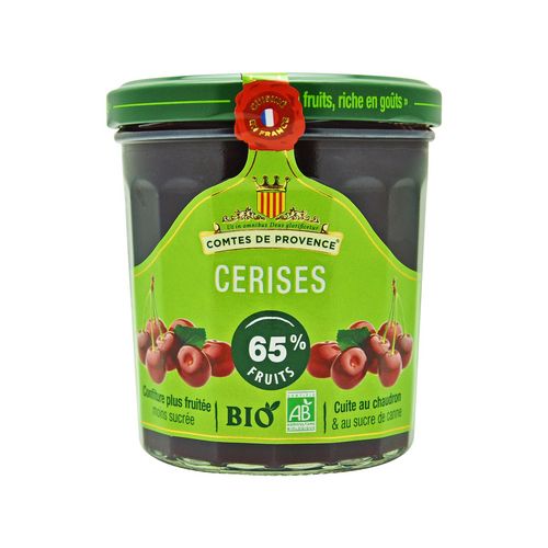 Confiture de cerises bio allégée en sucres, cuite au chaudron, élaborée avec 65g de fruits pour 100g de produit fini. Teneur en sucres : 42g pour 100g de produit fini. 30% de sucres en moins qu'une confiture traditionnelle. Sélection des fruits pour leurs qualités organoleptiques