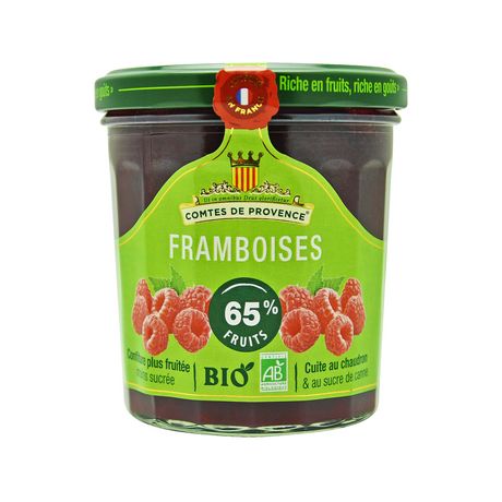 Confiture de Framboises bio allégée en sucres, cuite au chaudron, élaborée avec 65g de fruits pour 100g de produit fini. Teneur en sucres : 42g pour 100g de produit fini. 30% de sucres en moins qu'une confiture traditionnelle. Sélection des fruits pour leurs qualités organoleptiques