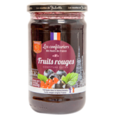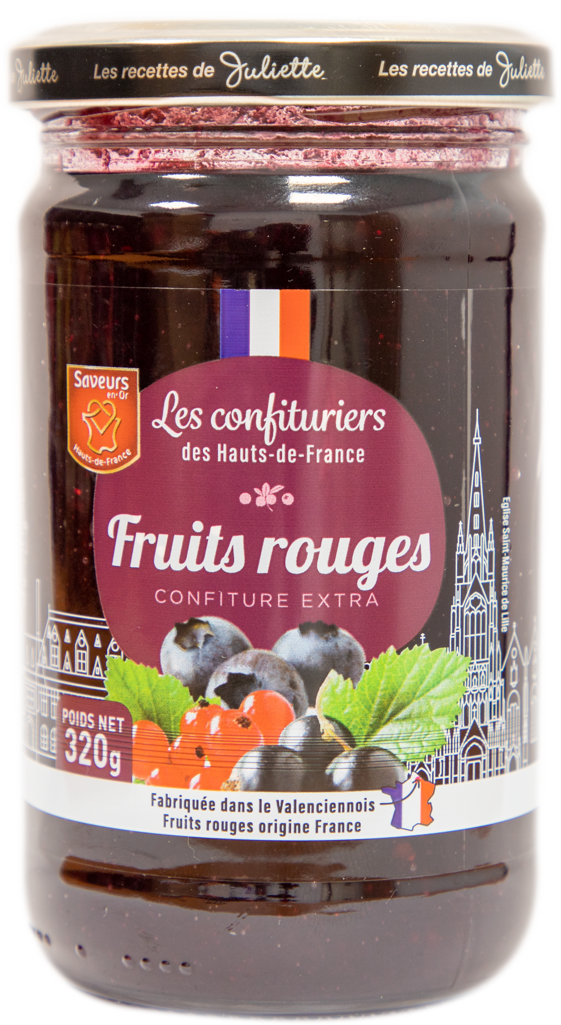 Ingrédients : Fruits (groseille 24%, myrtille 20%, cassis 10%)*, sucre*, gélifiant : pectines.Préparé avec 54g de fruits pour 100g de produit fini.*Origine France