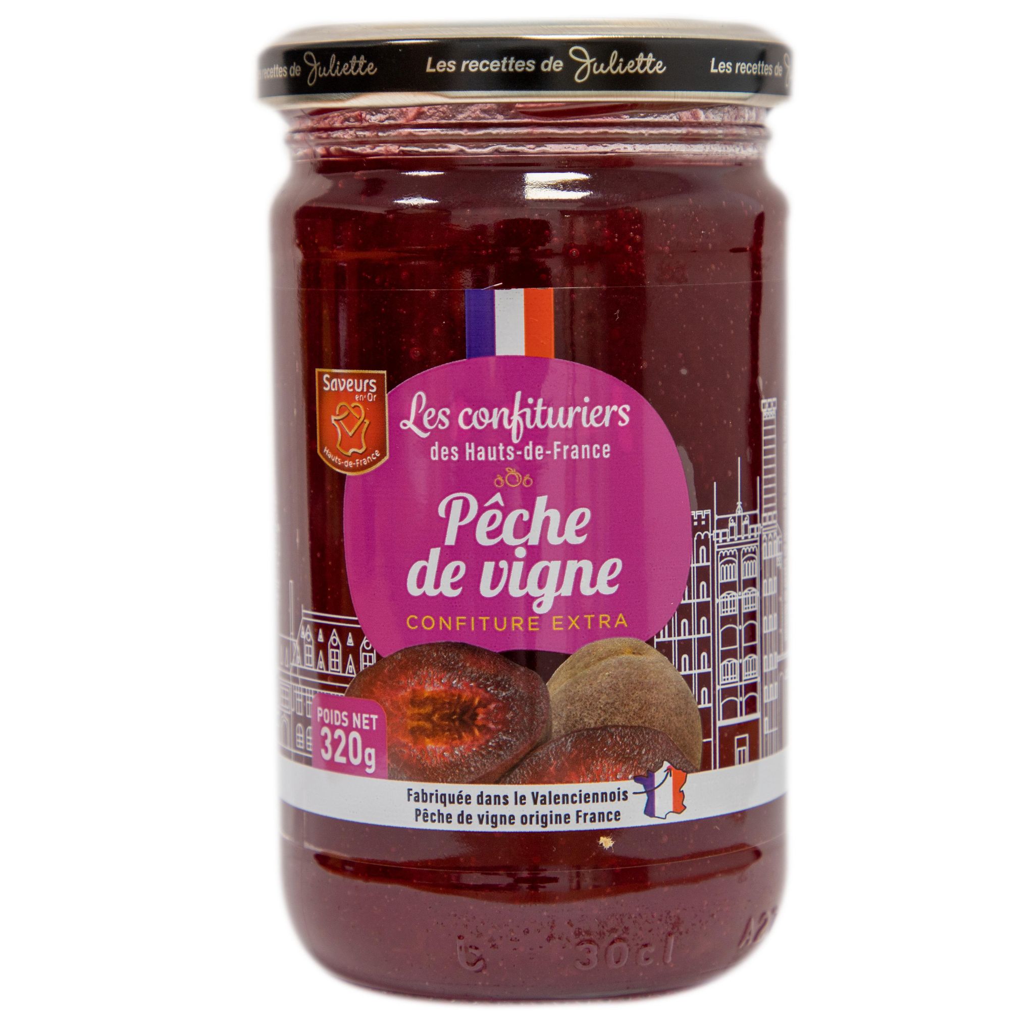 Ingrédients : Pêche de vigne*, sucre*, jus de citron concentré, gélifiant : pectines. Préparé avec 55g de fruits pour 100g de produit fini.Malgré tous nos soins cette confiture peut contenir un noyau.*Origine France