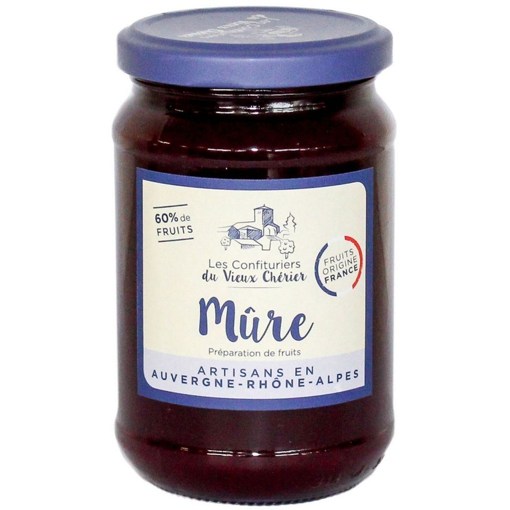Purée de mûre 67%, ( dont purée de mure 90%,sucre 10%), sucre, gélifiants ( pectine, citrate de calcium)