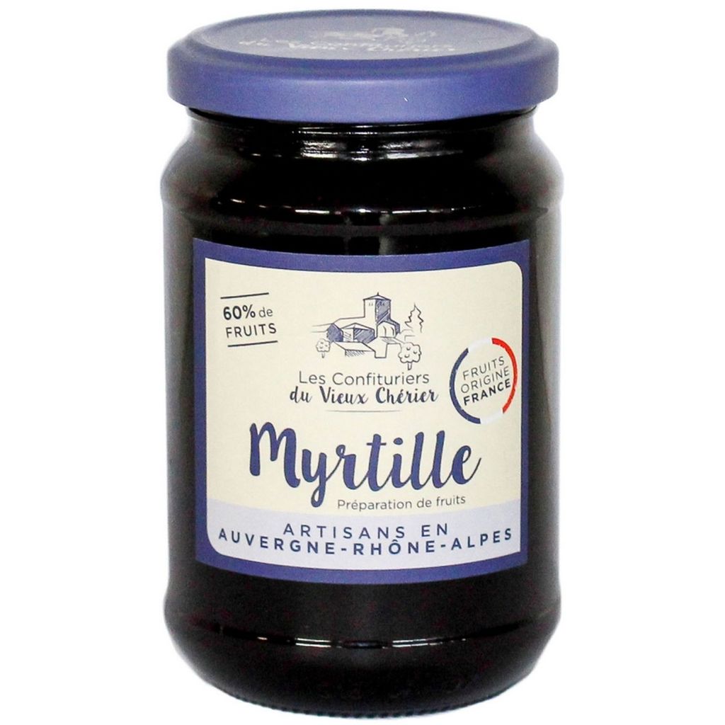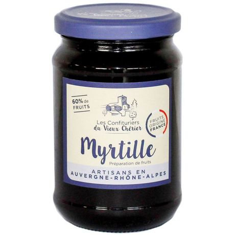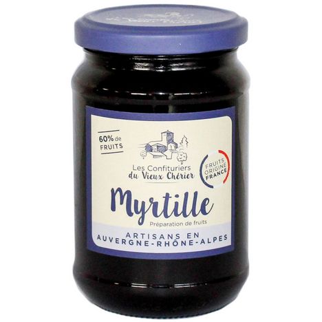 Myrtille 60%, sucre, gélifiants (pectine, citrate de calcium)