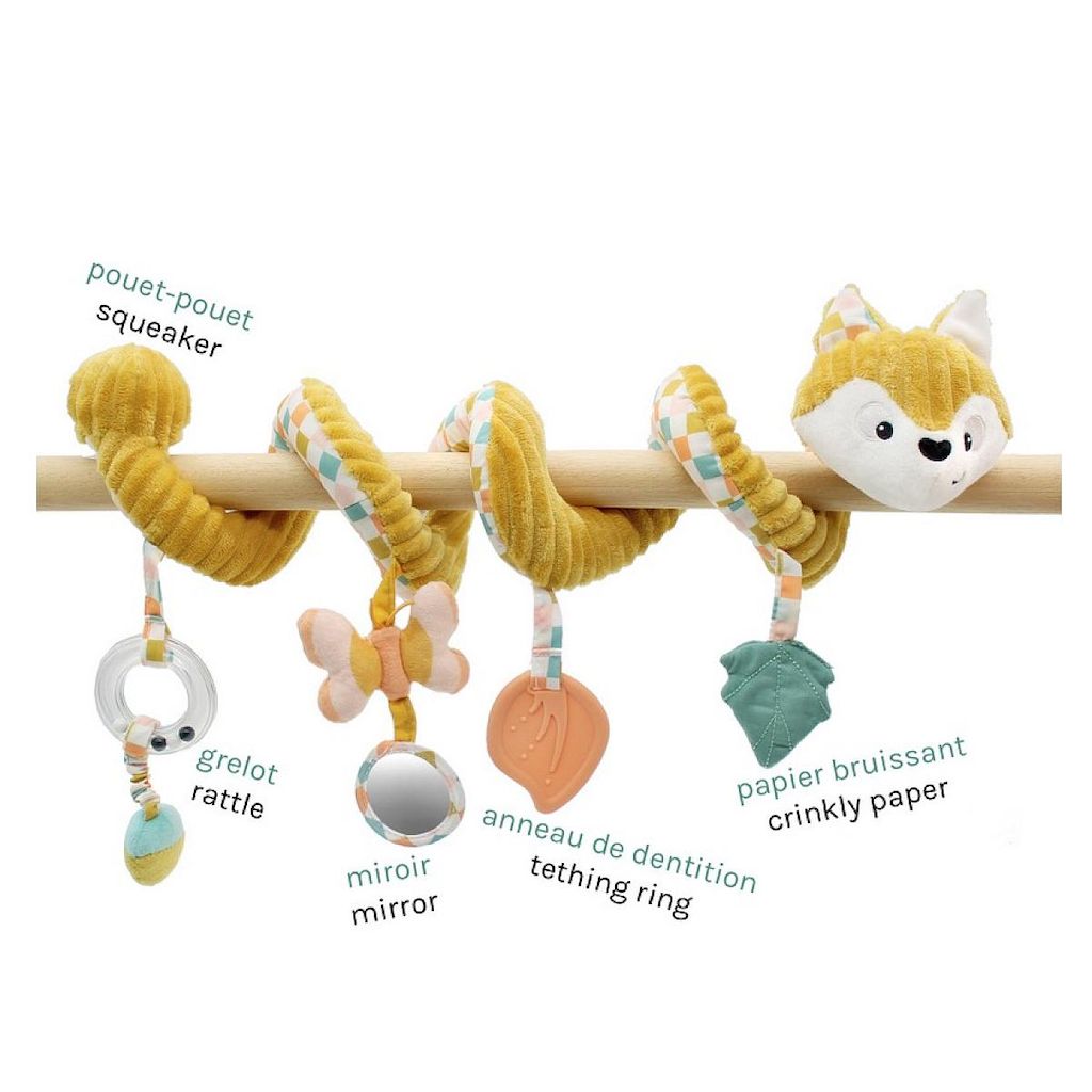 une spirale pour poussette avec différents jouets.