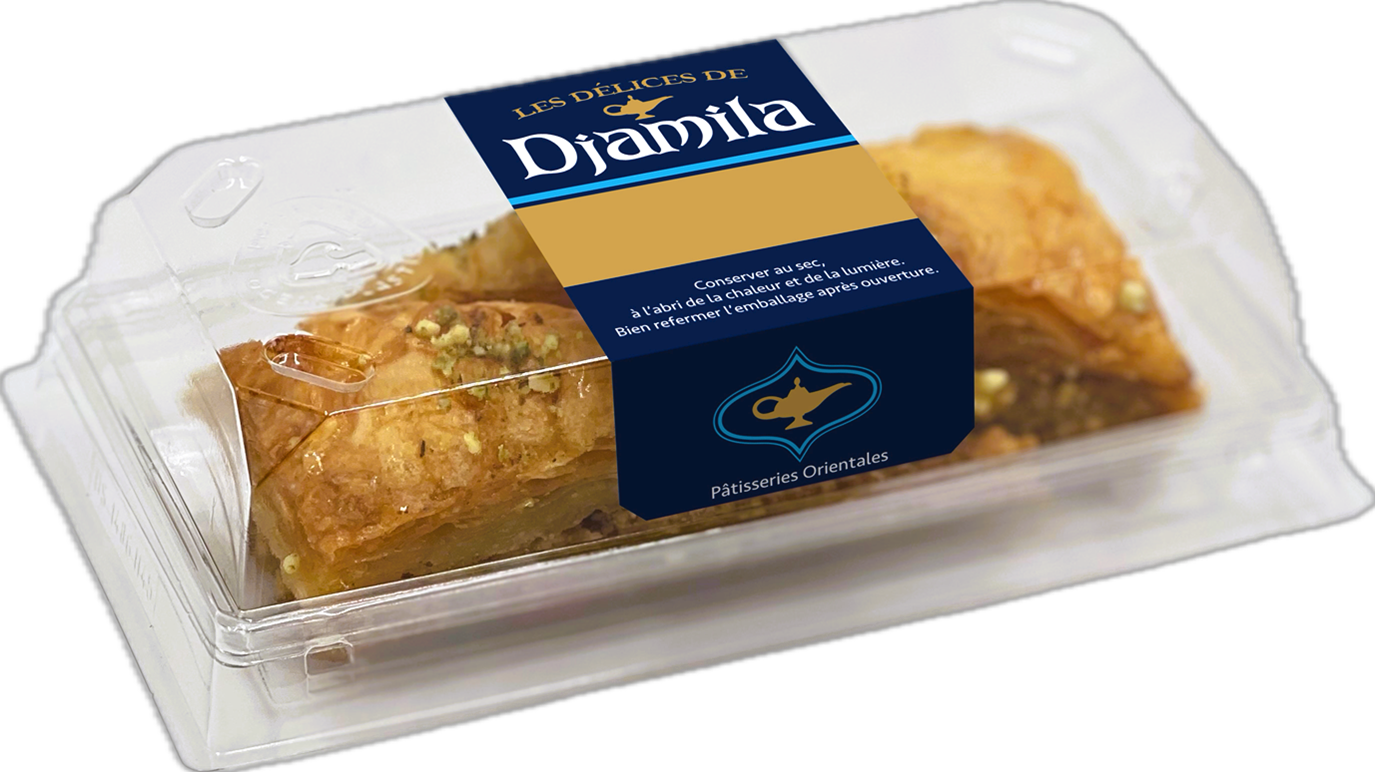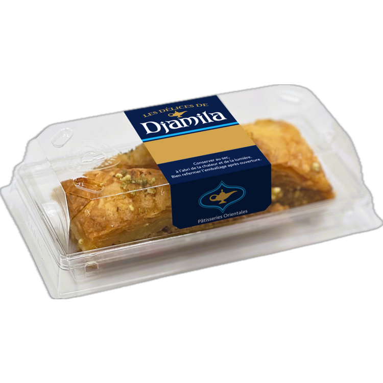 Ingrédients : pâte à filo (farine de BLÉ, eau, amidon de maïs, sel, conservateur : E202), AMANDES, margarine (graisse de palme, huile de colza, eau, sel, jus de citron), semoule de BLÉ, ARACHIDES 7,9%, sucre, arômes, Poudre décor (AMANDES, colorants (extrait de carthame, concentré de spiruline)). Trempé dans du sirop (sucre, sirop de glucose, eau, jus de citron).