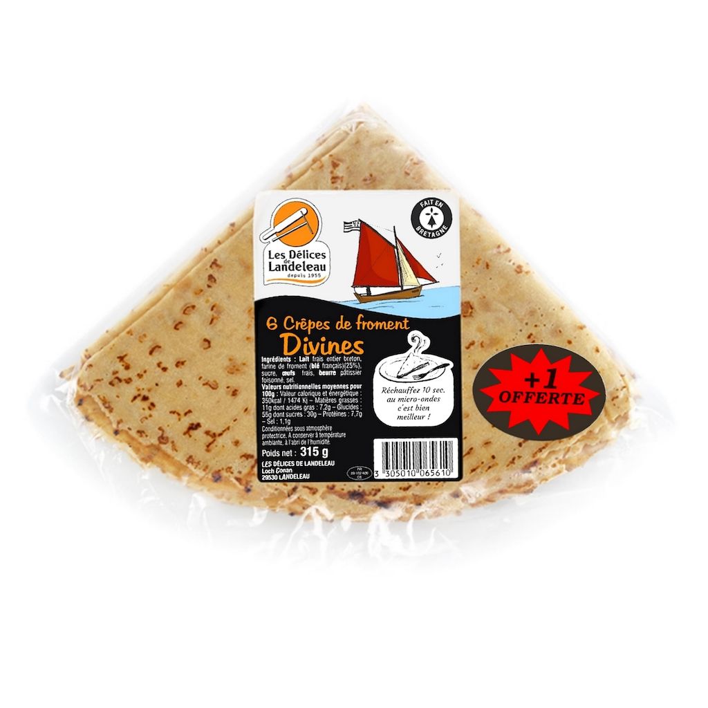Crêpes de froment sucrées, dorées et moelleuses, faites en Bretagne +1 crêpe offerte dans chaque sachet.