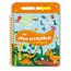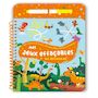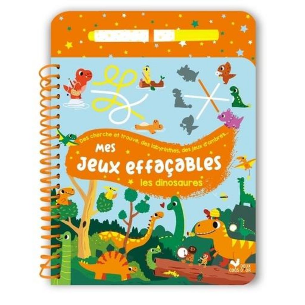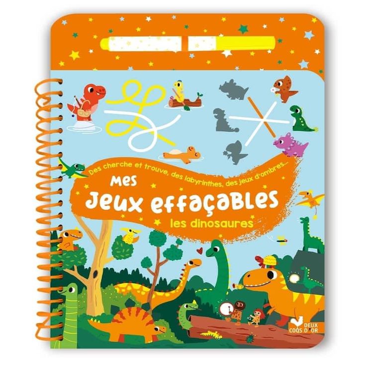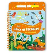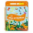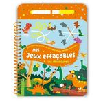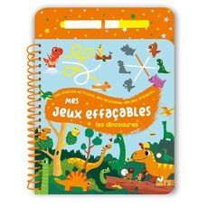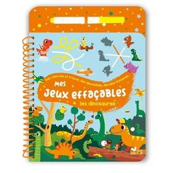 Un bloc de 24 pages relié par une spirale, avec des pages pelliculées et un feutre à l'encre effaçable inséré dans le plat 3, maintenu par un élastique et visible dès la couverture. 13 jeux à faire et refaire sur la thématique des dinosaures adaptés à la tranche d'âge, de type cherche et trouve, labyrinthes, 5 différences, points à relier, jeux des ombres...