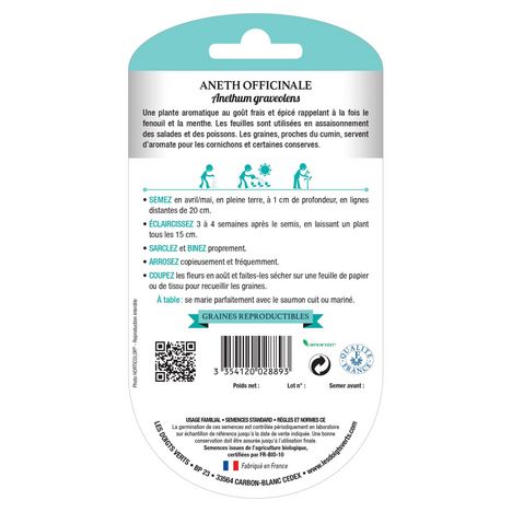 Produit: aneth Univers: Entretien et soin du jardin Utilisation: graines pour semis Issue de l'agriculture biologique Conditionnement: graines Semis: avril à mai Récole: août à octobre Marque: Les Doigts Verts