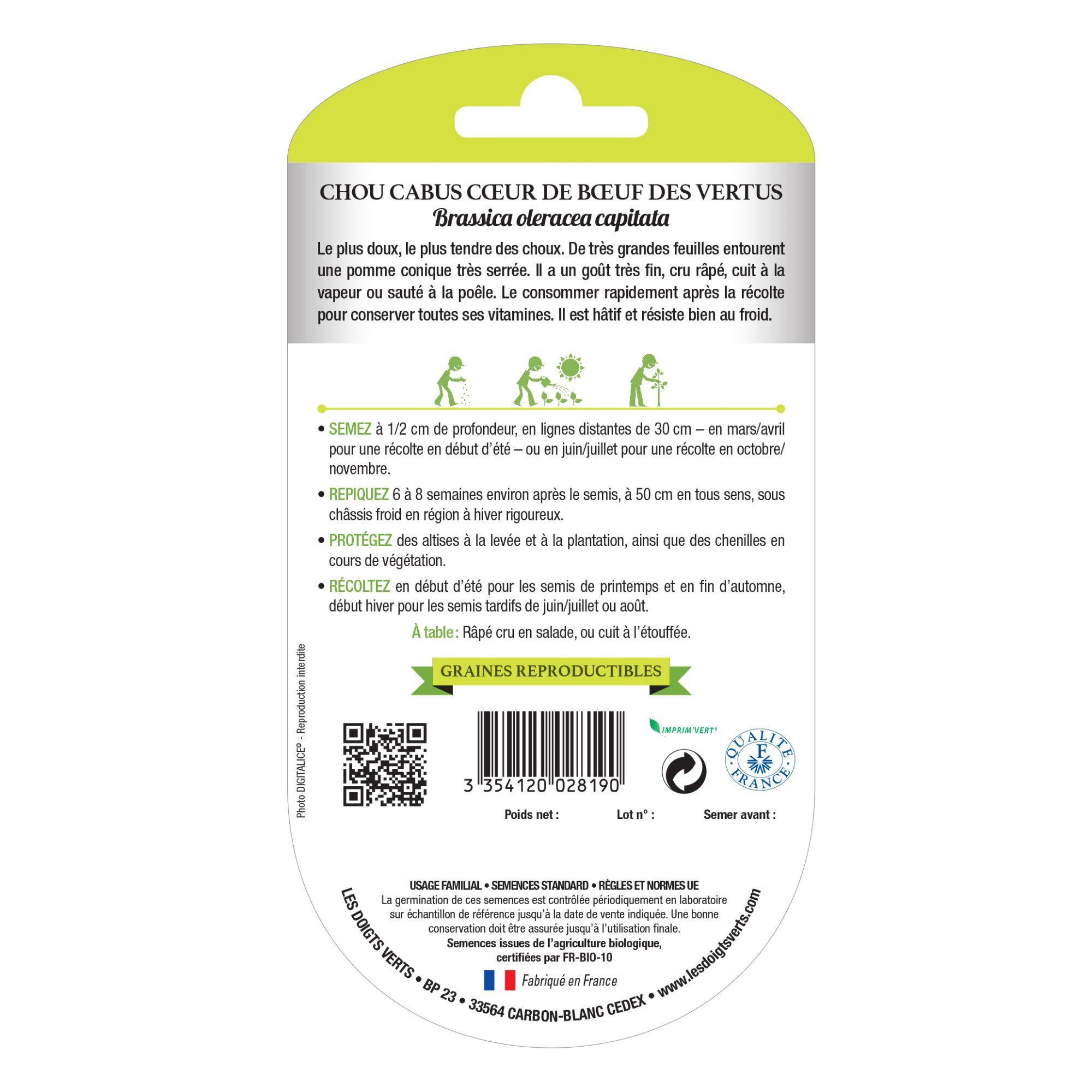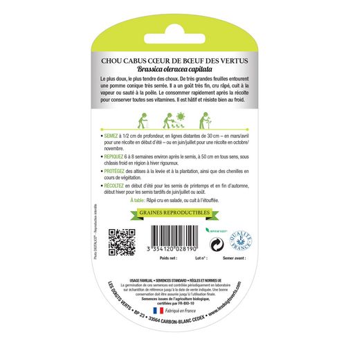 Produit: chou cabus coeur boeuf des vertus Univers: Entretien et soin du jardin Utilisation: graines pour semis Issue de l'agriculture biologique Conditionnement: graines Semis: juillet à fin août / mars à avril Récole: printemps / automne Marque: Les Doigts Verts