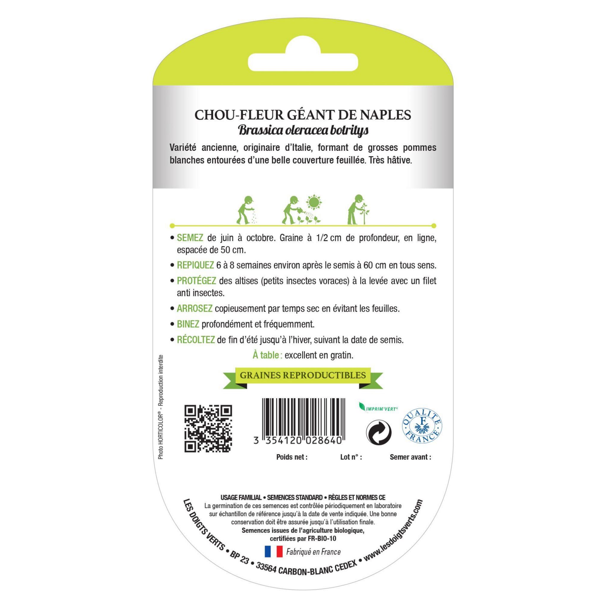 Produit: chou-fleur géant de Naples Univers: Entretien et soin du jardin Utilisation: graines pour semis Issue de l'agriculture biologique Conditionnement: graines Semis: juin à octobre Récole: septembre à février Marque: Les Doigts Verts