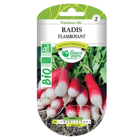 Produit: radis flamboyant Univers: Entretien et soin du jardin Utilisation: graines pour semis Issue de l'agriculture biologique Conditionnement: graines Semis: mars à septembre Récole: avril à octobre Marque: Les Doigts Verts