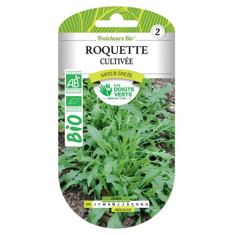 Produit: roquette cultivée Univers: Entretien et soin du jardin Utilisation: graines pour semis Issue de l'agriculture biologique Conditionnement: graines Semis: mars à août Récole: mai à septembre Marque: Les Doigts Verts