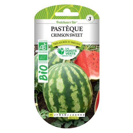 Informations produit:Produit: pastèque Crimson SweetUnivers: Entretien et soin du jardinUtilisation: graines pour semisIssue de l'agriculture biologiqueConditionnement: grainesSemis: mars à maiRécole: juillet à septembreMarque: Les Doigts Verts
