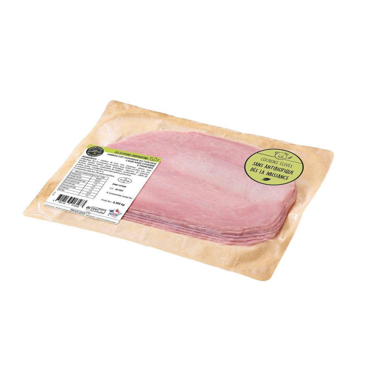 Ingrédients : Jambon de porc issu d’animaux élevés sans antibiotique dès la naissance et nourris sans OGM (0.9%), sel, dextrose, bouillon (bette, carotte, acérola), arômes naturels, antioxydant : érythorbate de sodium, conservateur : nitrite de sodium.