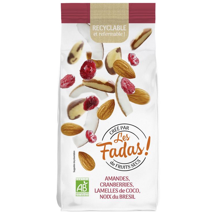 Ingrédients : Ingrédients : AMANDES décortiquées* 30%, cranberries séchées* 30% (cranberries*, sucre*, huile de tournesol*), NOIX DU BRESIL* 20%, lamelles de noix de coco* 20%. *Ingrédients issus de l'agriculture biologique.