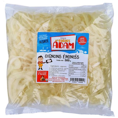 Oignons crus émincés, prêts à utilisation, conditionnés sous atmosphère modifiée.