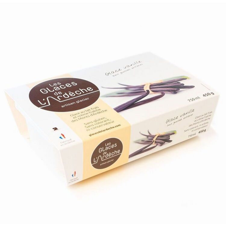 LAIT entier; CREME fraîche; sirop de sucre inverti; saccharose; sirop de glucose d'amidon de maïs; jaunes d'ŒUFS; LACTOSE et protéines de LAIT; pâte de vanille : sirop de glucose, arôme naturel de vanille Bourbon de Madagascar, graines de vanille épuisées; émulsifiant : mono-diglycérides d'acide gras; stabilisants : graines de caroube, alginate de sodium, gomme de guar, carraghénanes; gousses de vanille.