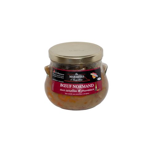 Ingrédients: Viande de boeuf de Normandie (France) 45%, carottes 35%,bouillon de cuisson, cidre Brécéen (SULFITES), pruneaux 5%, échalotes, crème d'Isigny AOP (LAIT), vinaigre de cidre (SULFITES), amidon modifié, sel, sucre, pommeau, poivre, muscade.