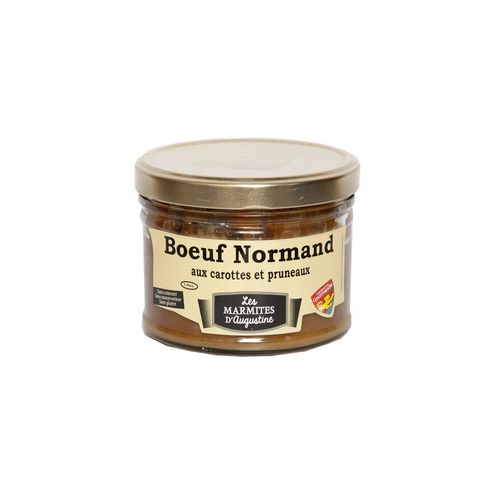 Viande de boeuf de Normandie 48%, carottes 37%, jus de boeuf, CIDRE, pruneaux 5%, échalotes, CRÈME FRAÎCHE D'ISIGNY, VINAIGRE DE CIDRE, amidon modifié, sel, sucre, POMMEAU, POIVRE BLANC, muscade.
