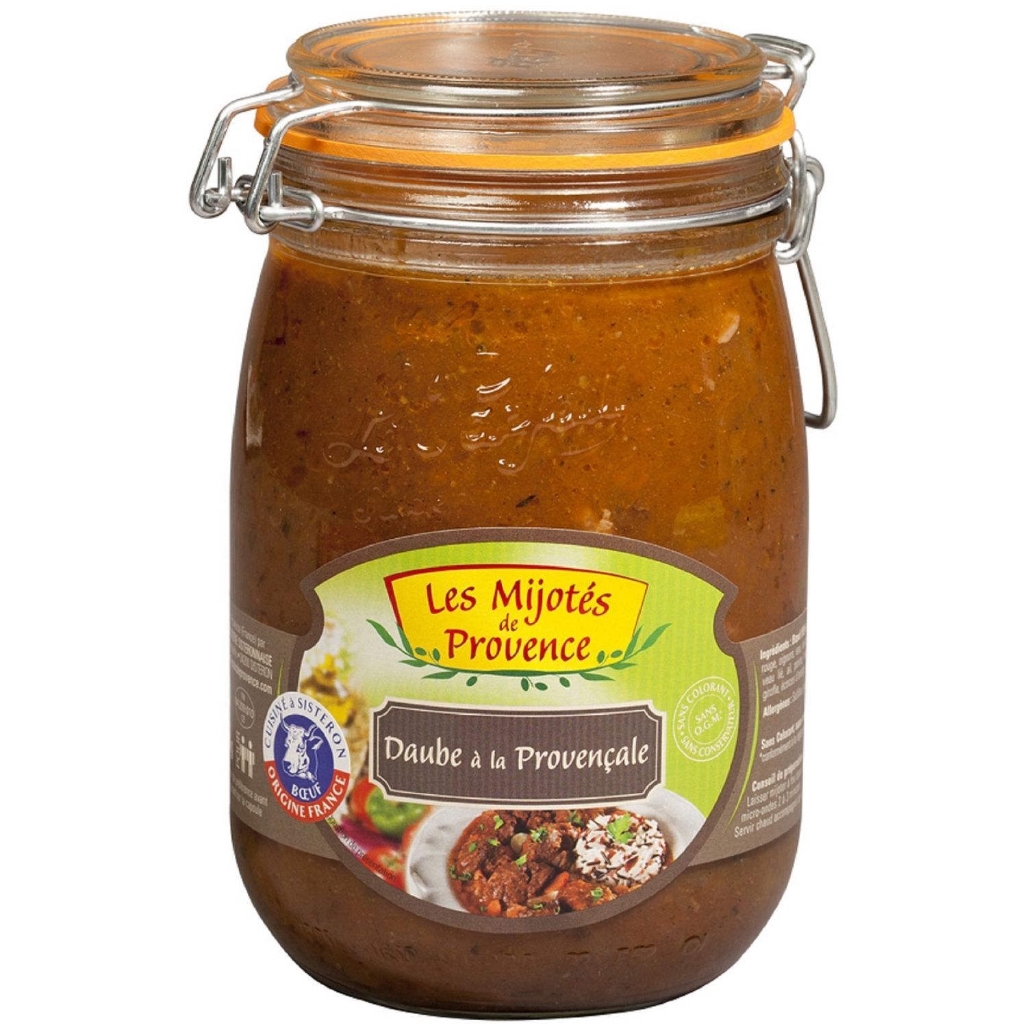 Bœuf Origine France(54%) Sauce (46%) : vin rouge (SULFITES), tomates concassées, oignons, carottes, eau, lardon, couenne, tomate concentré, vinaigre vin rouge, olives noires dénoyautés, ail, huile d'olive, huile de tournesol, sel, orange poudre, herbes de Provence, poivre, clous de girofle, laurier.