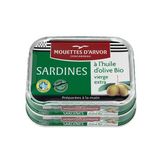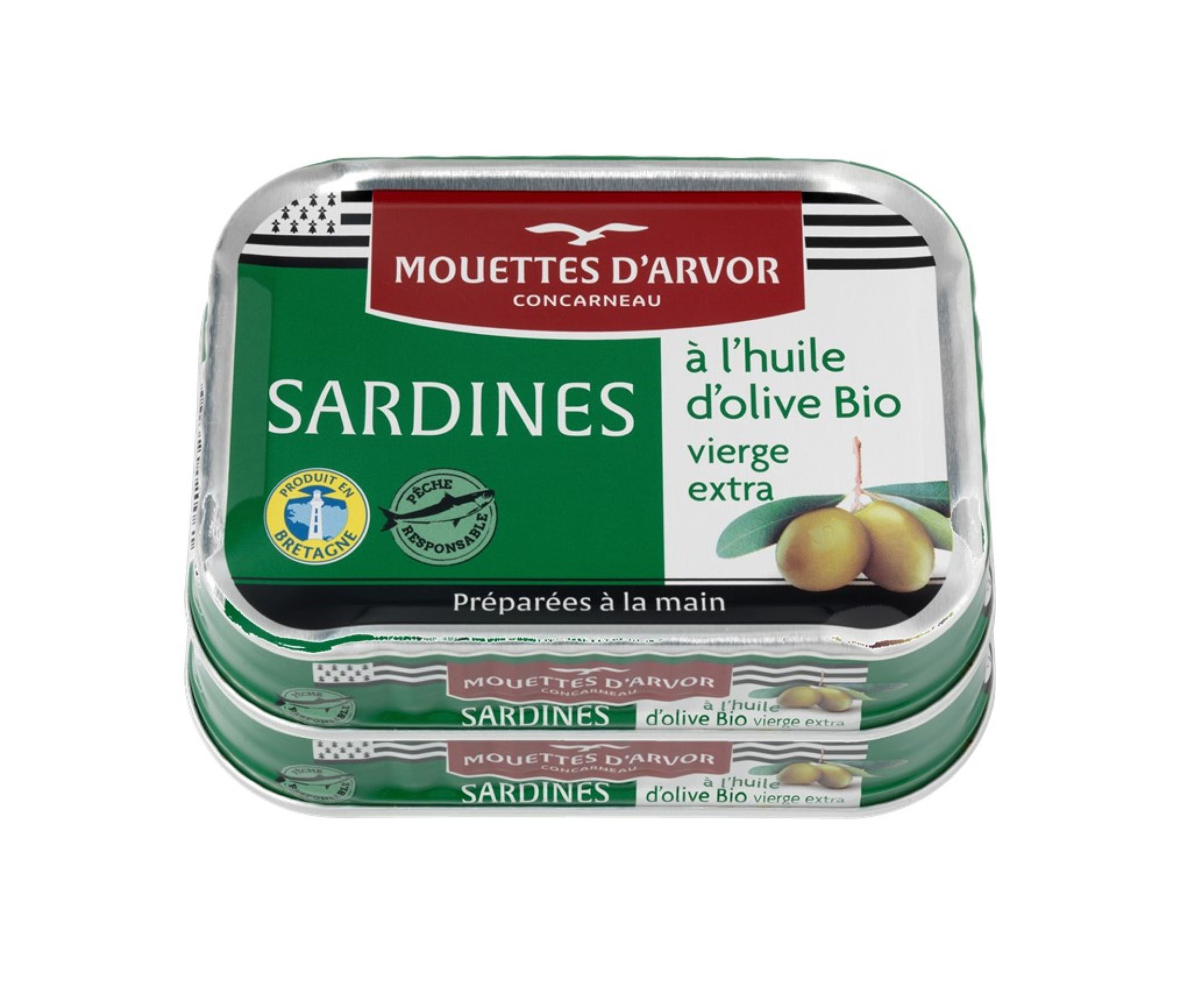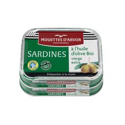 SARDINES 75%, huile d’olive vierge extra* 25%, sel. *25% des produits d'origine agricole sont issus de l'agriculture biologique. Certifié par FR-BIO-10.