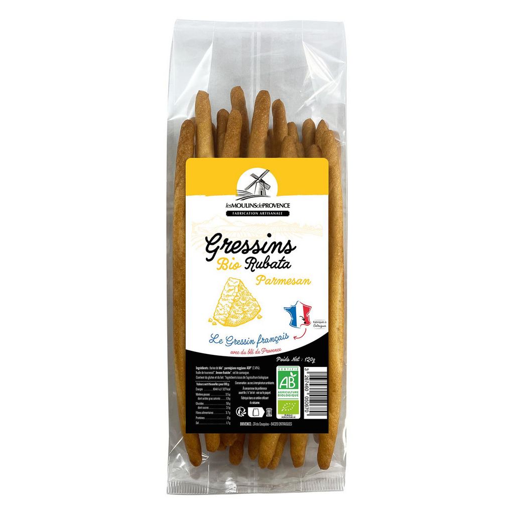 Fabriqués artisanalement dans notre atelier en Provence, ces gressins traditionnels "Rubata" sont roulés à l'ancienne pour former de délicieux bâtonnets croustillants. Une recette à base de blé cultivé en Provence et agrémenté de Parmesan AOP pour plus de goût !