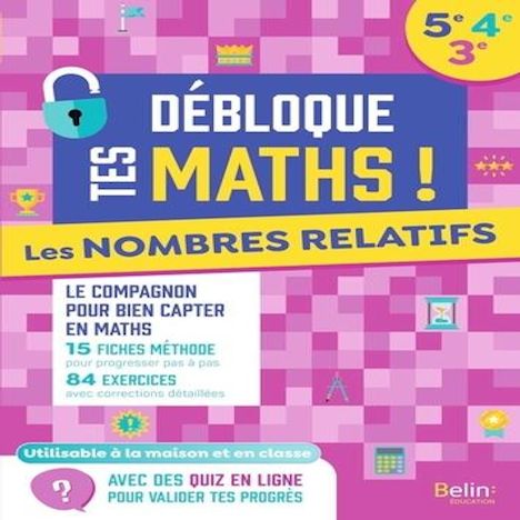 L'ouvrage s'inscrit dans la nouvelle collection parascolaire de soutien en mathématiques collège Débloque tes maths. Chaque ouvrage est consacré à une difficulté mathématique et permet de : Comprendre avec des méthodes pour lever chaque point de blocage Se rassurer avec des exercices d'application très simples et de difficulté progressive pour préparer les évaluations De réaliser des quiz en ligne permettant de valider chaque étape et de passer des niveaux, comme dans les jeux vidéo. Cet ouvrage permet de lever les blocages sur les nombres relatifs durant tout le cycle 4 (5e, 4e et 3e) : notmbres négatifs, additions et soustractions de nombres relatifs, multiplications et divisions de nombres relatifs.