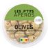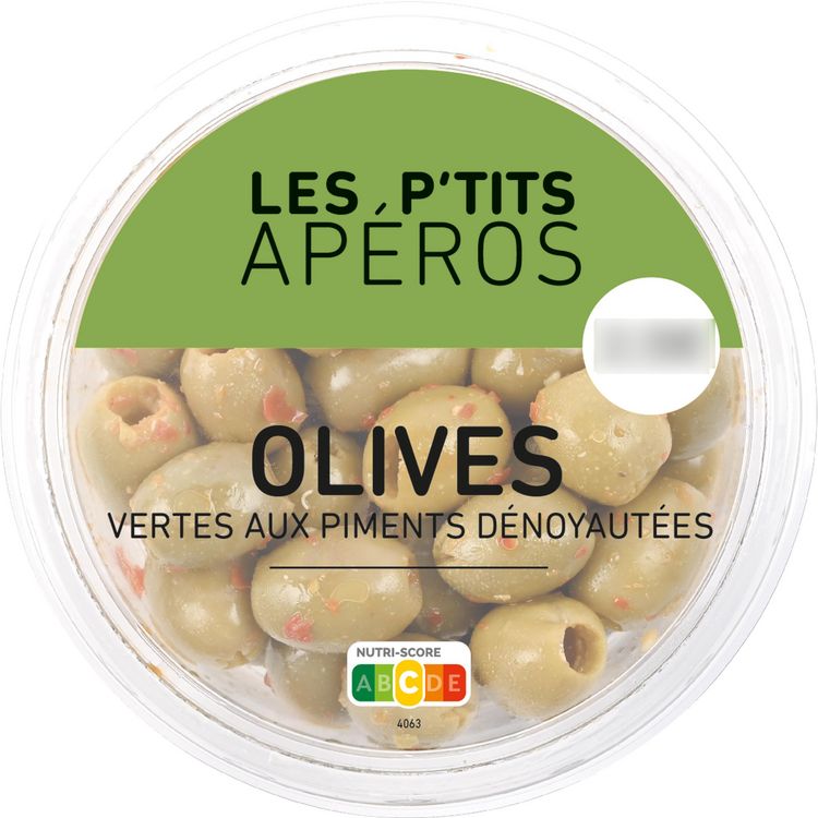Ingrédients : Olives vertes dénoyautées 93% (olive, sel, acidifiants : acide lactique, acide citrique), poivron rouge (poivron, sucre, sel, acidifiants : acide acétique, acide citrique), piment rouge 3% (piment rouge, sel, correcteur d'acidité : acide acétique), huile de colza.