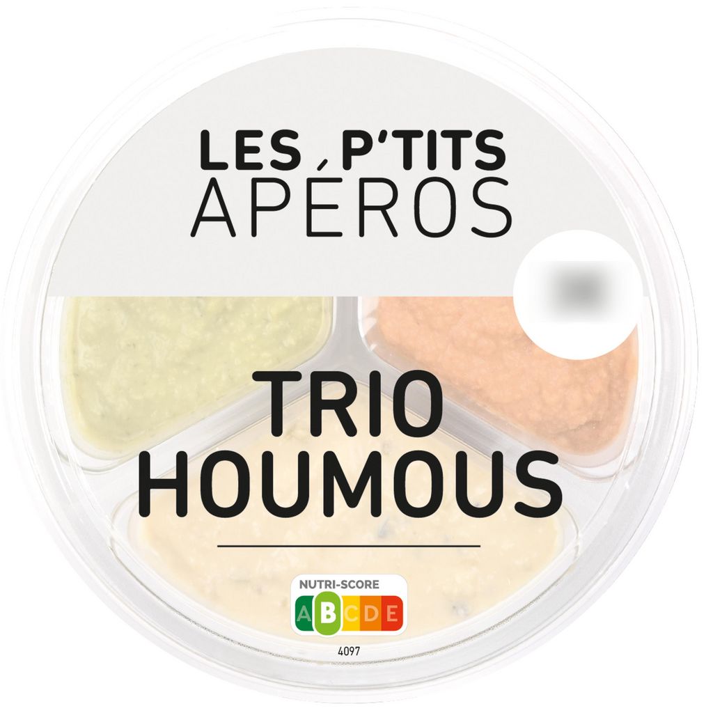 Ingrédients : Houmous tomates : pois chiches 33%, eau, huile de colza, pâte de sésame 13.8%, tomates séchées au soleil 13% (tomate, sel), jus de citron concentré, ail en poudre, sel, épices, conservateur : sorbate de potassium. Houmous olives : pois chiches 45%, huile de colza, pâte de sésame 13.8%, eau, olive noires 4.5% (olive, sel, stabilisant : E579), olives vertes 4.5% (olive, sel, acidifiants: acide lactique, acide citrique), jus de citron concentré, ail en poudre, sel, épices, conservateur : sorbate de potassium. Houmous basilic : pois chiches 45%, eau, huile de colza, pâte de sésame 12,4%, basilic 7.1%, huile de tournesol, jus de citron concentré, sel, ail en poudre, conservateur : sorbate de potassium ; épices, antioxydant : acide ascorbique.