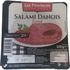 Salami danois : Saucisson pur porc à pâte fortement colorée et à grains fins, poussé sous boyau de grand diamètre, étuvé et fumé. Le produit est prétranché (tranches empilées et conditionnées sous atmosphère protectrice dans une barquette thermoformée avec un film d'operculage).