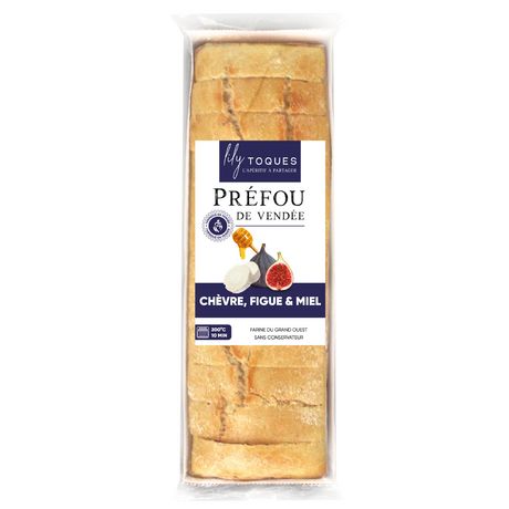 Pain spécial 64,3% (farine de BLE, eau, huile d'olive, sel, levure, gluten de BLE, agent de traitement de la farine : acide ascorbique), FROMAGE frais de chèvre 9,9%, fromage frais au LAIT de vache, crème fraîche épaisse (CREME fraîche, ferments lactiques), figues 5,7%, échalote, miel 1%, arôme naturel de chèvre, BEURRE, sel, poivre.