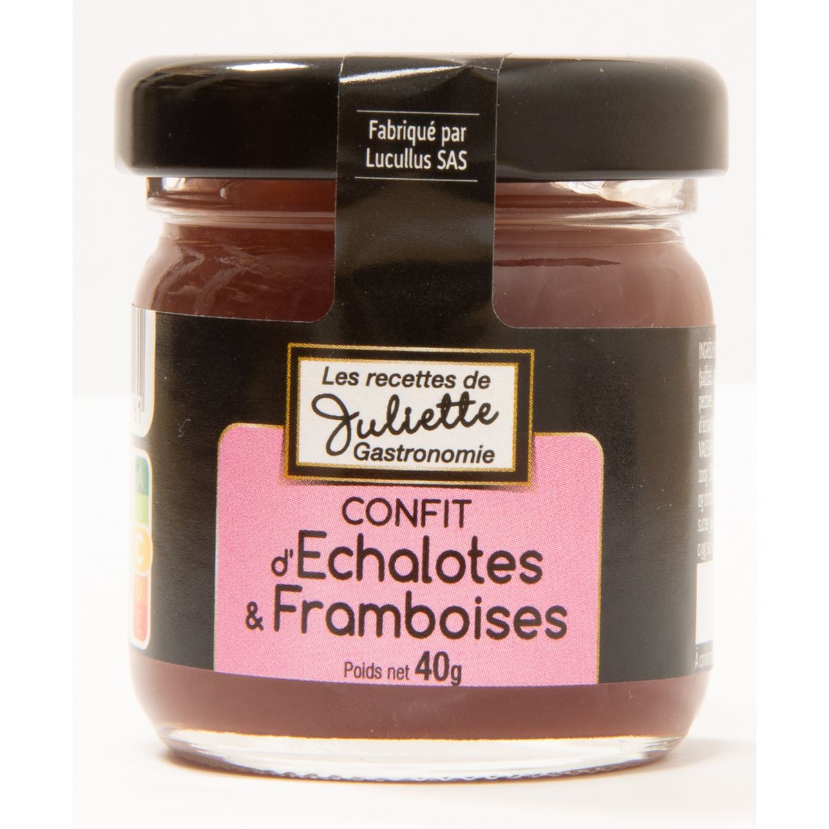 Ingrédients : Echalote 56%, sucre, vin rouge (SULFITES), vinaigre d'alcool, framboise 5%, gélifiant : pectines, sel de Guérande. Préparé avec 61g d'échalote et framboise pour 100g de produit fini
