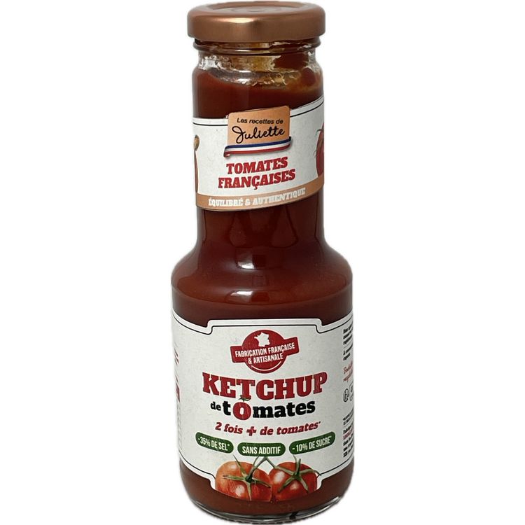 Ingrédients : Tomate (318g de tomate fraiche pour 100g de produit fini) origine France, eau, vinaigre d'alcool, sucre, sel, oignons grillés, poivre, épices.