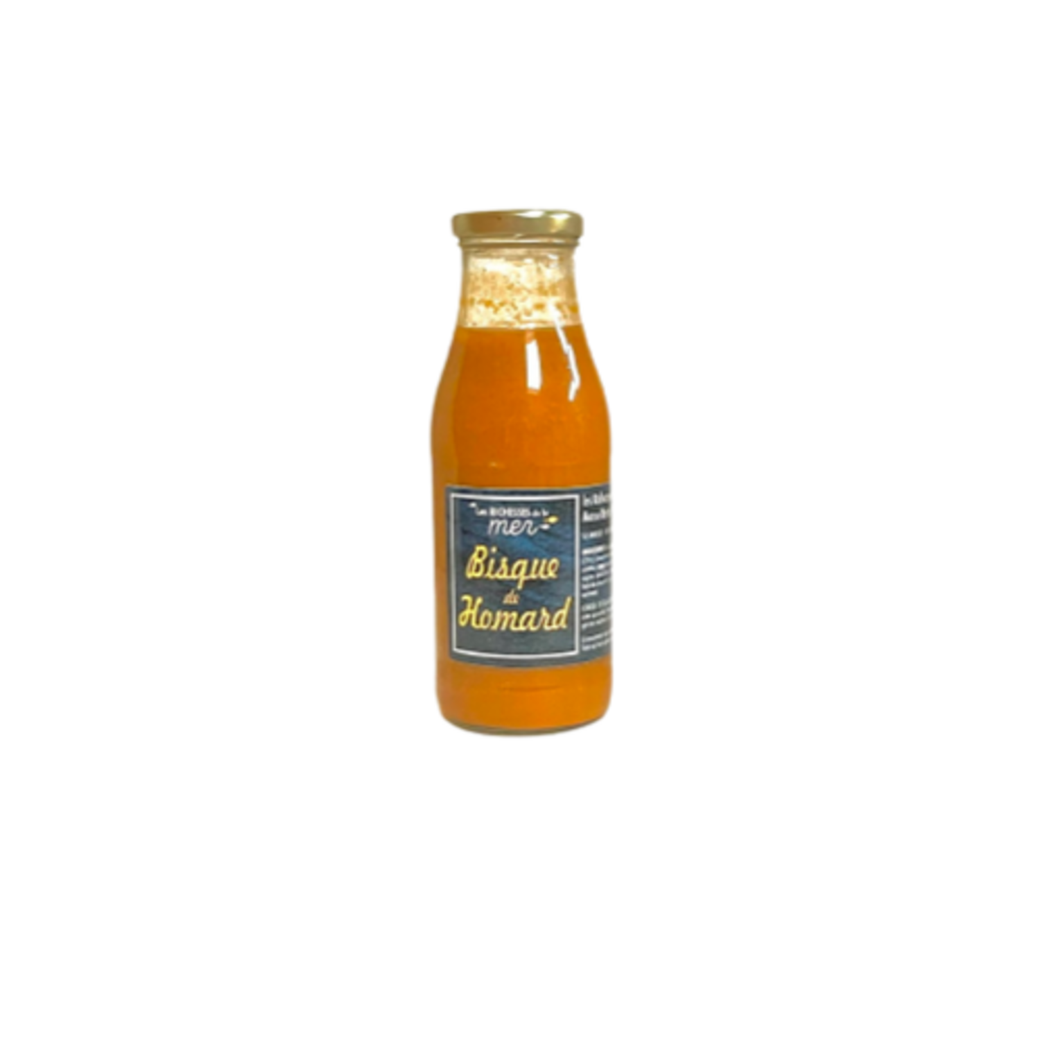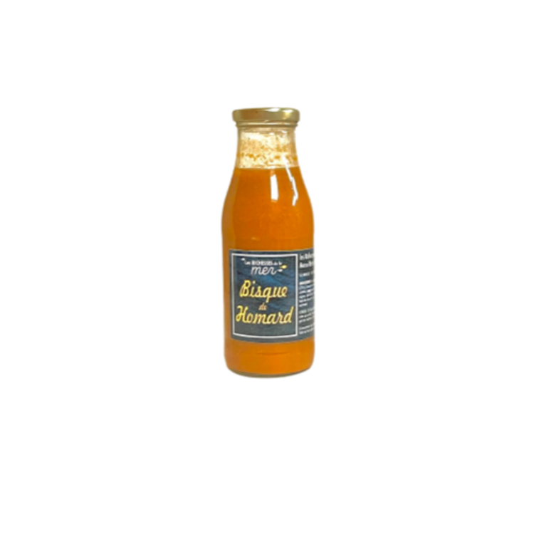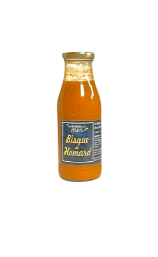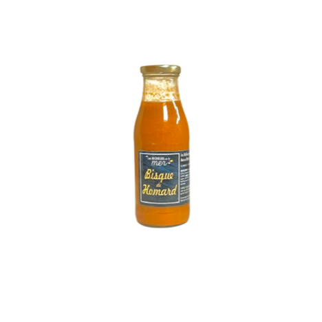 Ingrédients : Eau, chair de homard (6%), poissons entiers pêchés en Méditerranée crabes de Méditerranée, concentré de tomate, amidon modifié de maïs, oignons, vin blanc*, carottes, crème liquide (protéine de lait*), sel, beurre, huile de colza, cognac, épaississant : gomme de xanthane, pulpe d'ail*, persil, poivre, laurier, fenouil, thym, piment fort, estragon, girofle.