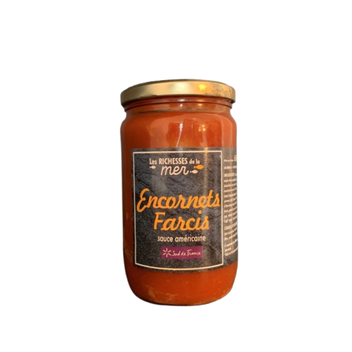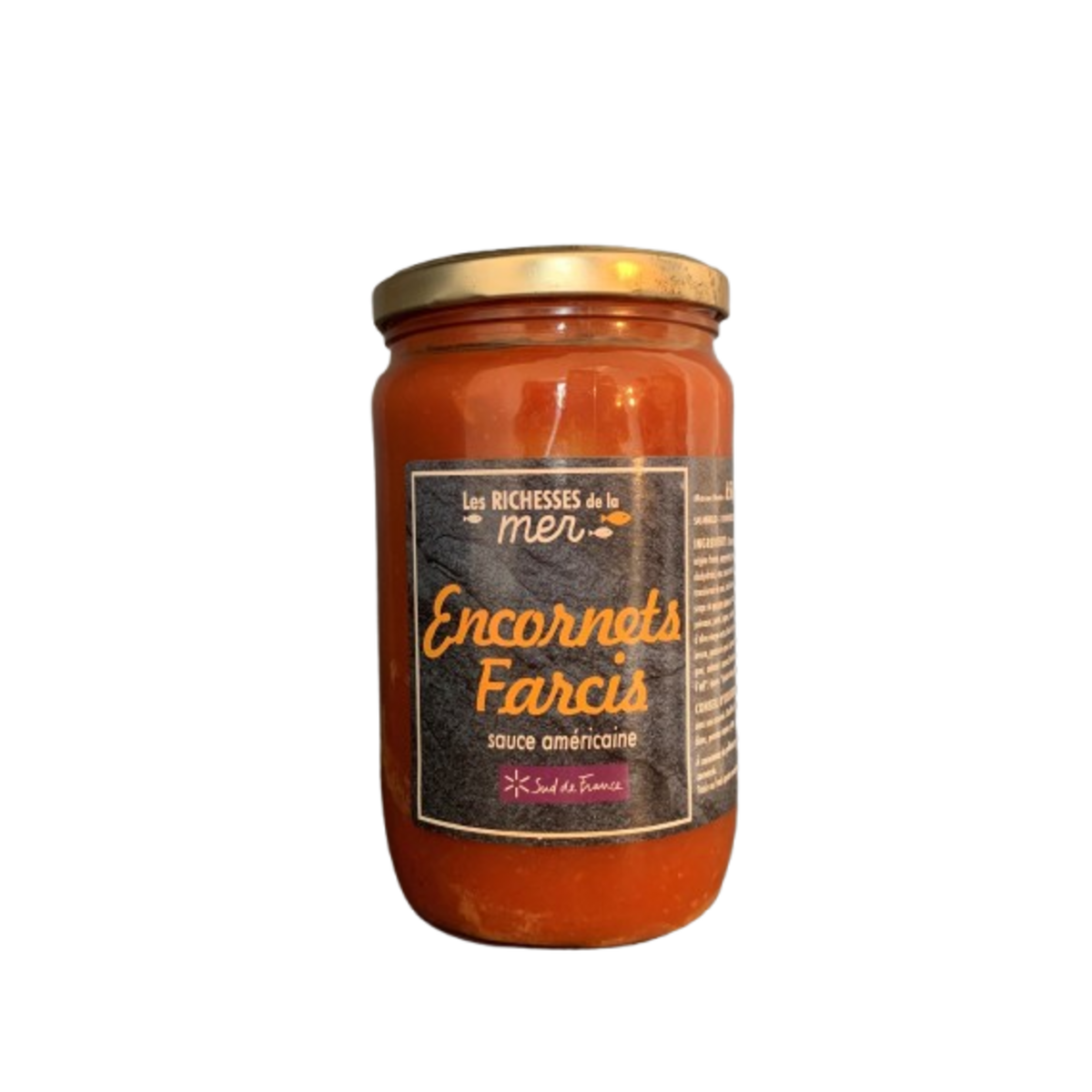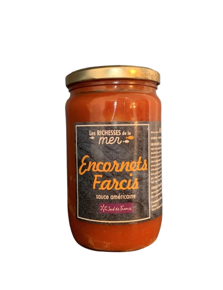 Ingrédients : Encornets (29%) , farce de porc origine France (26%), eau, sauce tomate (tomates, sirop de glucose, amidon transformé de maïs, huile de tournesol, acidifiant : acide citrique), concentré de tomate, vin blanc, chapelure (blé), amidon modifié de maïs, jaune d’œuf déshydraté, pulpe d’ail, oignon, sel, huile de colza, fond brun (arômes, farine de blé, extraits de levure, graisse de poule, légumes (cèleri), épaississant : gomme de guar, colorant : caramel), persil, épaississant : gomme de xanthane, poivre, tabasco (piment rouge, vinaigre, sel), thym, safran, estragon.