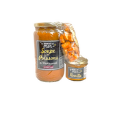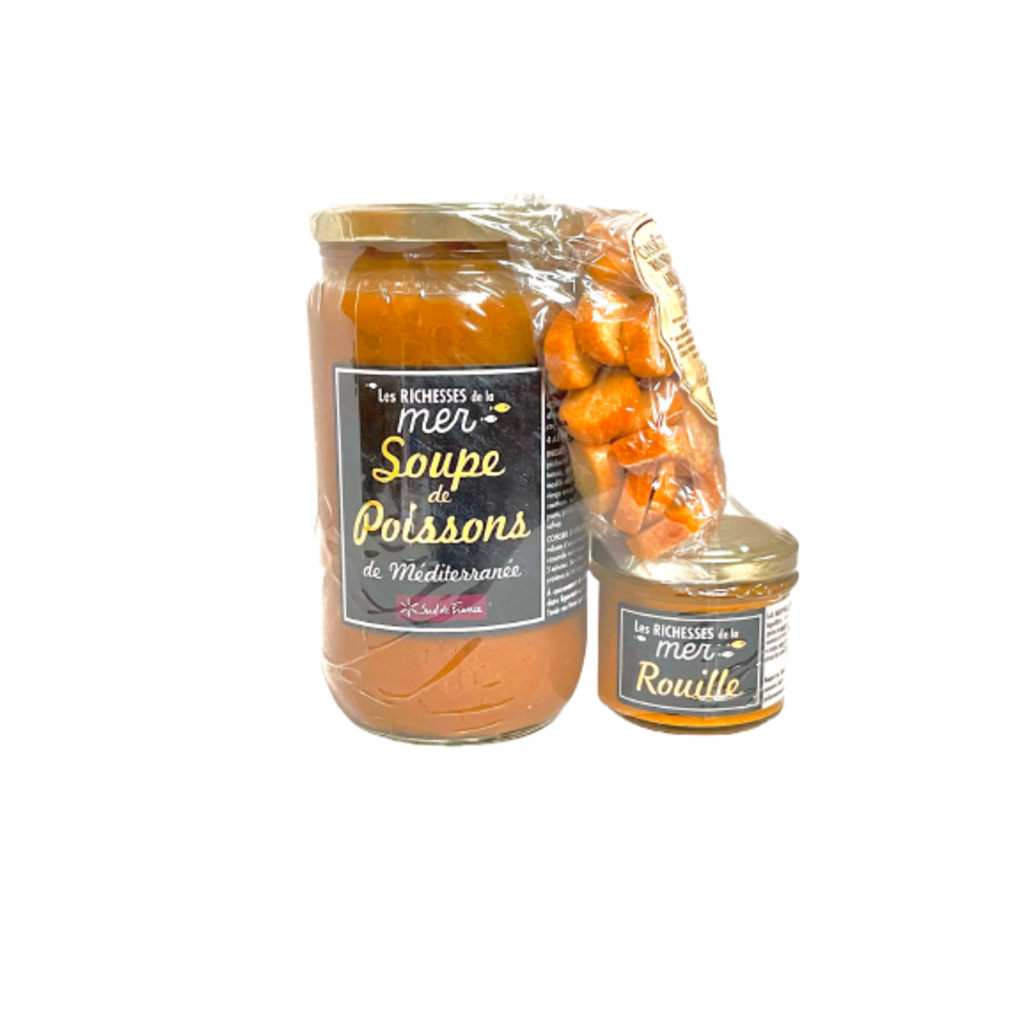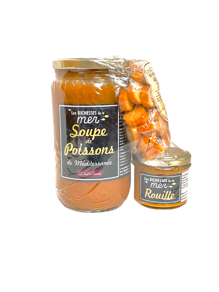 Ingrédients : SOUPE: Eau, POISSONS entiers sauvages pêchés en Méditerranée (25%), concentré de tomate, VIN* blanc, carottes, oignons, amidon modifié de MAIS, sel, poireaux, huile de colza, épaississant : gomme de xanthane, pulpe d'AIL*, persil, cognac, pastis, poivre, laurier, fenouil, girofle, thym, safran