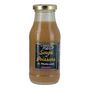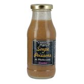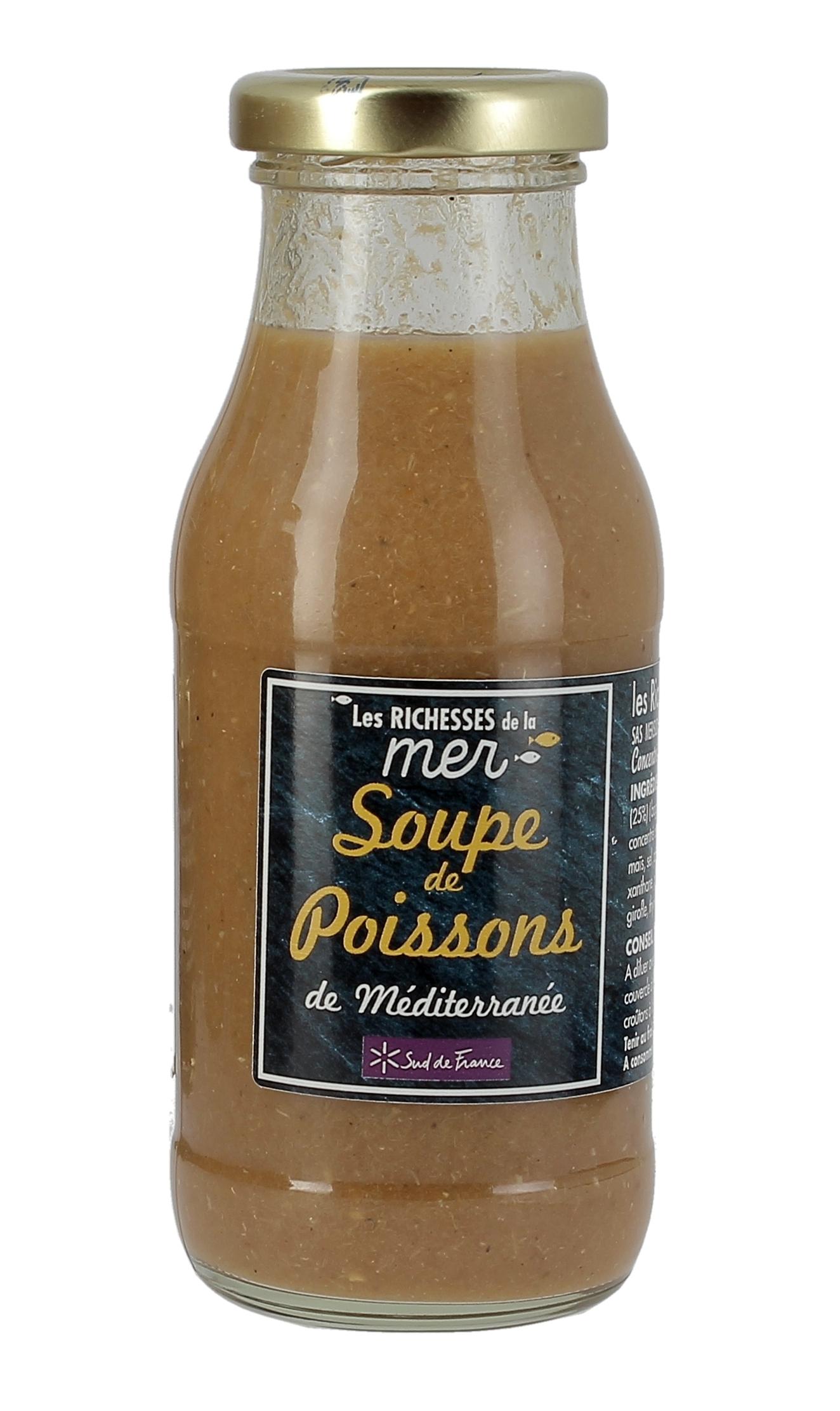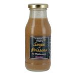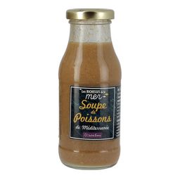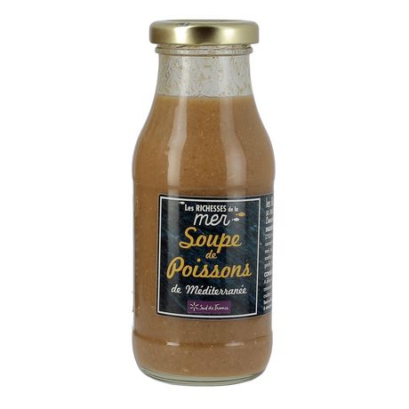 Ingrédients : Eau, poissons entiers (25%), concentré de tomates, vin blanc, carottes, oignons, amidon modifié de maïs, sel, poireaux, huile d'olive vierge extra, épaississant : gomme de Xanthane, pulpe d'ail, persil, cognac, pastis, poivre, laurier, fenouil, girofle, thym, safran