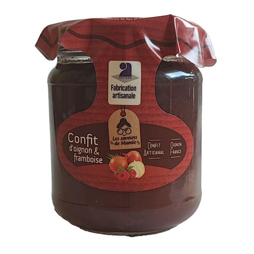 Ingrédients : oignon*, sucre*, framboise (origine UE et non UE), vinaigre d'alcool, vin blanc, gélifiant: pectines, sel de Guérande.