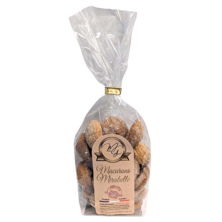 Sans gluten, poudre d'amandes, sucre inverti, blanc d'oeufs, arôme mirabelle, additif : E202