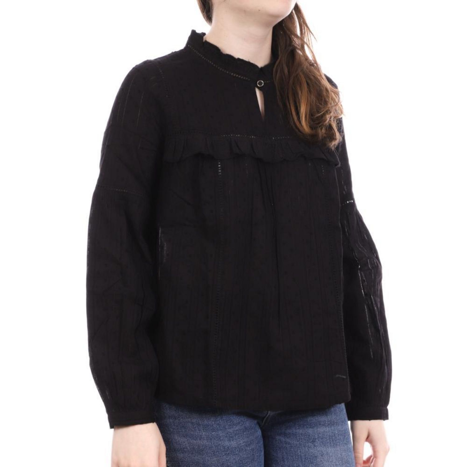 Craquez vite pour la blouse femme de la marque Les Tropéziennes Manches longues Col montant avec bouton doré Volants Tissu fantaisie Coloris : Noir Composition : 100% coton