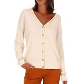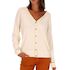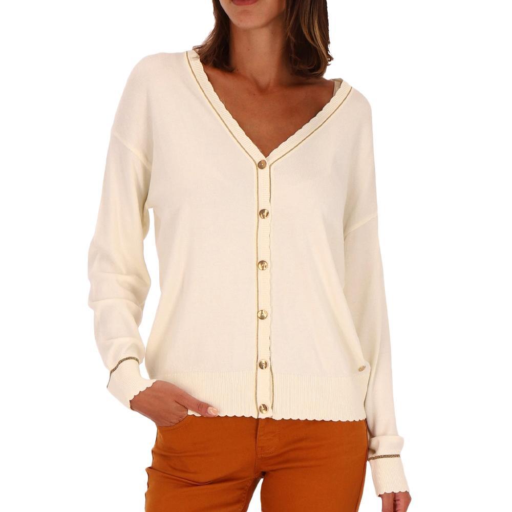 Craquez pour le gilet femme de la marque Les TropéziennesManches longuesCol VFermeture boutonnéeDétail brillantColoris : Écru Composition : 87% viscose , 12% polyester , 1% fibre métallique