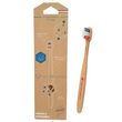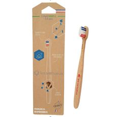 Brosse à dents en bois de hêtre rouge issue de forêts éco-gérées françaises - bois déclassé en scierie - filaments base végétale - Etui carton PECF encres végétales - 3 coloris assortis ; marquage bleu, blanc, rouge